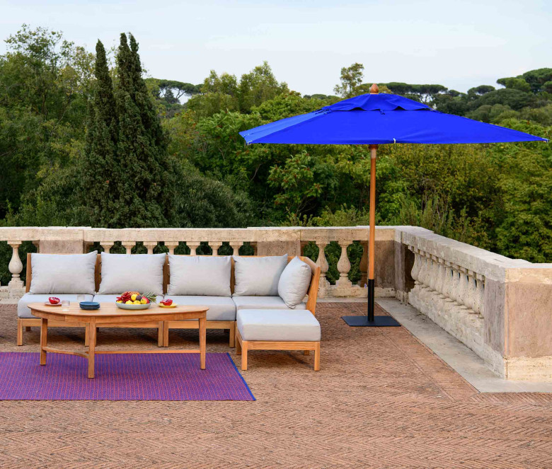 Ideal for a terrace or poolside setting, the square parasol offers both style and shade. It is sold without steel base. Here, traditional manual techniques meet the perfection demanded by the brand: handsewn canopies in waterproofed ecru cotton canvas or coloured canvas. The Douglas pine wood, used in the ribs and the mast, is crafted as it has been for four generations by the Italian workshop that fabricates the parasols for Tectona.