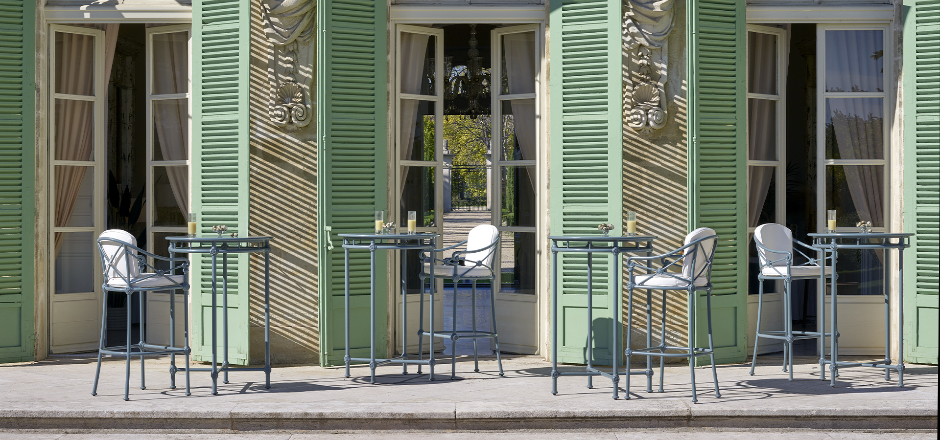 Designed for hotel terraces, restaurants, and exceptional outdoor spaces, the 1800 bar armchair and table blend lightness, comfort, and enduring quality. A true celebration of neoclassical elegance, this new furniture brings a renewed classical sophistication to hotel terraces.