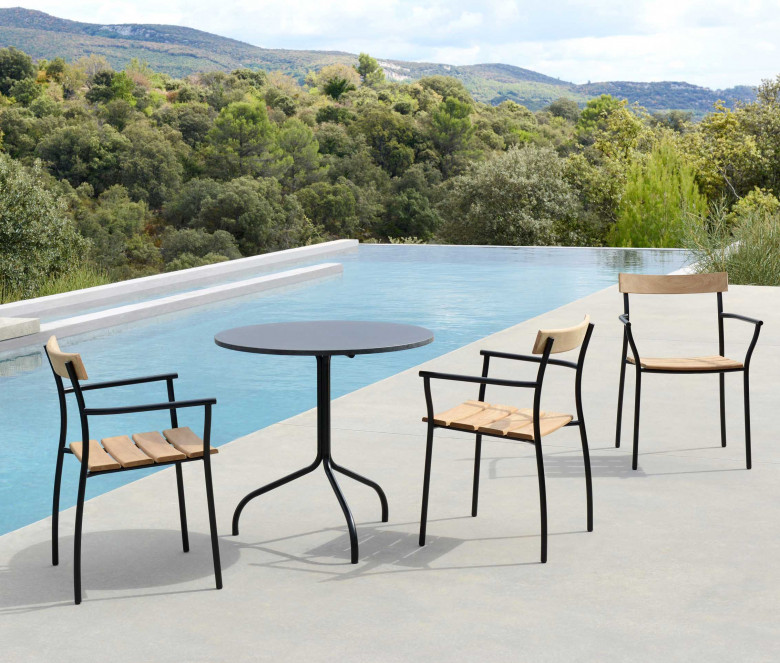 La collezione Cicala ha qualcosa di ondeggiante, di naturale, senza mai perdere la purezza della sua linea. L'unione del teck con l'acciaio inossida bile per la struttura della poltrona e del tavolo quadrato, la loro armonia fatta di curve e l'apertura dei braccioli, invitano a una seduta conforte vole ed elegante. Il tavolo rotondo in granito offre qualcosa di elementare e di danzante. Sempre diverso da qualsiasi posizione lo si osservi. Le proporzioni molto studiate di Cicala ne fanno una collezione intima e accogliente allo stesso tempo.
