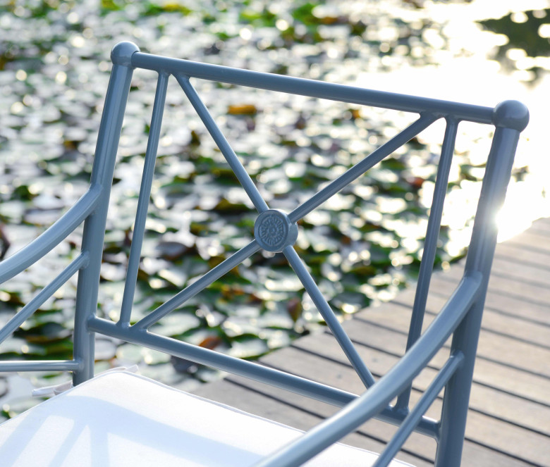 Nella pià grande tradizione del ferro battuto, la sedia e la poltrona 1800 in alluminio laccato si caratterizzano per la loro leggereza, il loro colore blu-grigio ed il loro schienale a crociera ispirato in stile Direttorio. La poltrona è venduta con cuscino in Sunbrella bianco.